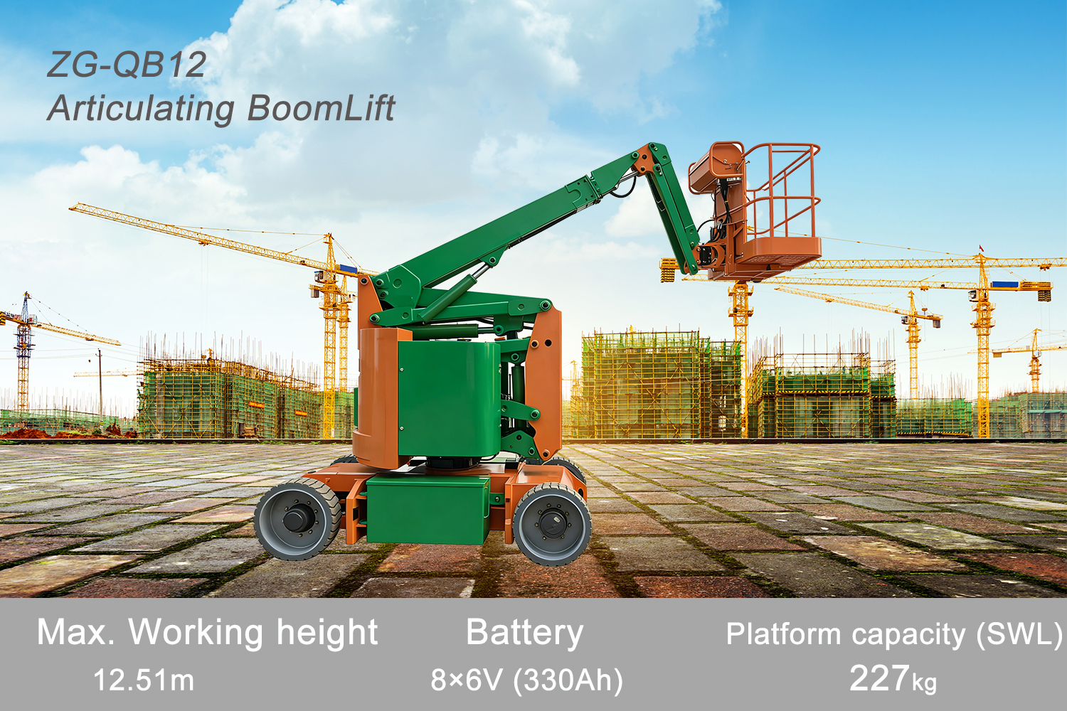 ZG-QB12 is a highly maneuverable articulating boom lift designed for high-altitude operations in complex spaces. Equipped with 365° non-continuous turntable rotation + 180° platform rotation structure, combined with a maximum operating radius of 7.51m and a spanning height of 4.64m, it can flexibly cover hard-to-reach areas such as building facades and equipment tops. With a maximum working height of 12.51m and a platform load capacity of 227kg, it supports single-person efficient operation with tools. The body is equipped with an 8×6V (330Ah) battery pack, balancing endurance and power. The compact size in the stowed state (5.78m×1.46m×2.05m) and 2.98m outside turning radius allow flexible transfer in narrow spaces, adapting to multi-scenario high-altitude operation needs.